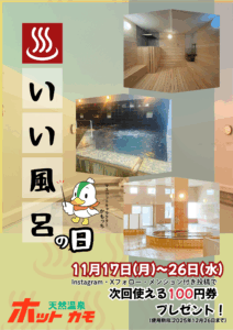 11月26日まで開催中! 11月26日までの期間限定で 【いい風呂の日】企画絶賛継続中!! ホットカモのインスタアカウントをフォローして 期間中来館入浴時にメンション付き投稿! たったこれだけで12月2日まで使える100円割引券プレゼント!! リールでもストーリーでもフィードでもなんでもOK! 投稿したら受付で見せてくださいね ホットカモInstagramはこちら→天然温泉ホットカモ