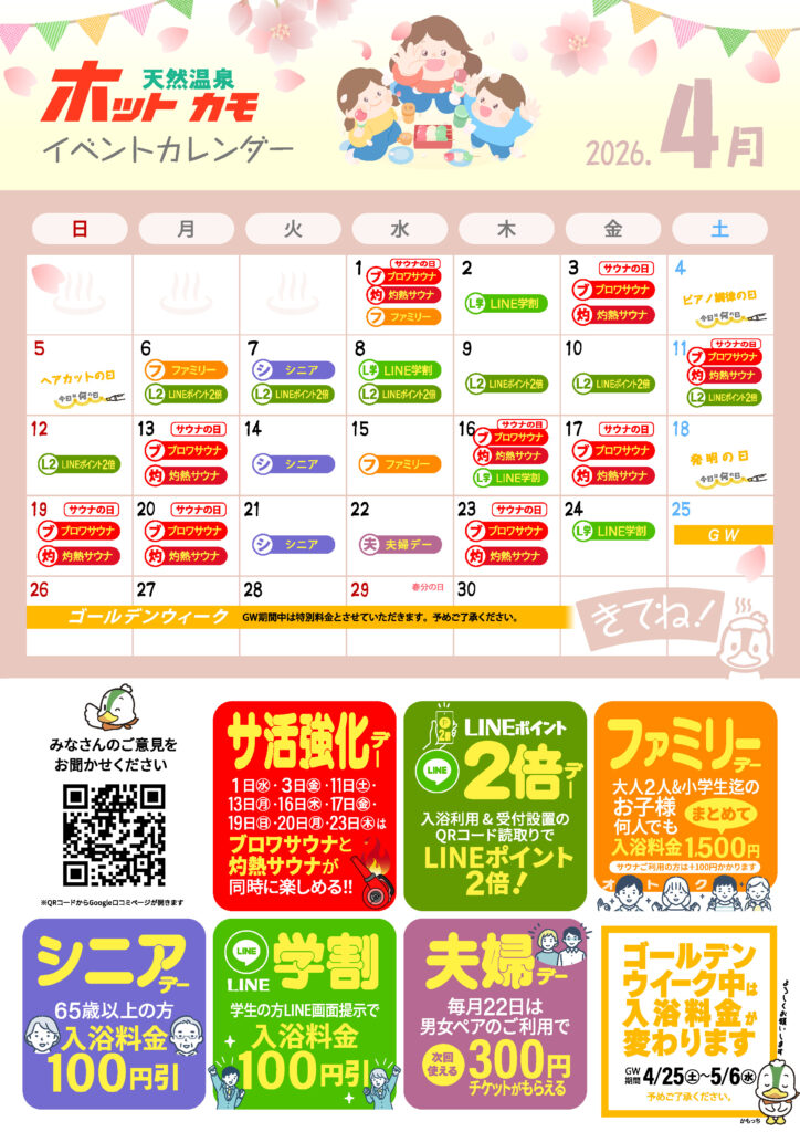 2025年 12月イベントカレンダー 【2025年 12月イベントカレンダー】天然温泉ホットカモ『12月イベントカレンダー』を更新致しました。 冬至の日のゆず湯に合わせてバスソルト作りワークショップ開催決定!その他にも… 天然温泉ホットカモをさらに楽しめる様々なイベントを開催中 秋の夜長を最高に楽しむには やっぱりホッカモでしょホットカモで今秋ももっとホットに過ごしましょう🦆詳しくは、天然温泉ホットカモ 店内告知・公式LINE・公式HPなどから“12月イベントカレンダー”をチェックしてくださいスタッフ一同みなさまのご来店をお待ちしております! 引き続き 天然温泉ホットカモをご愛顧の程よろしくお願い致します