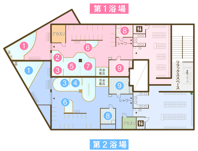 施設紹介 地下2000mから汲み上げた天然ラジウム温泉。 男湯、女湯あわせて8種類以上のお風呂はすべて天然温泉。短時間で体の芯まで温もり、湯冷めしにくいと好評です。 2Fフロア案内図 ①露天風呂 屋上にある露天風呂。風を感じ、空を見ながら癒されてはいかが?ゆっくりとおくつろぎください。 ②バイブラ浴 浴槽の底から出る細かい気泡がはじける際に発生する超音波には、リラクゼーション効果や血行促進効果があります。 ③電気風呂 ピリピリとした電気の刺激が筋肉の疲労や神経の痛みを軽減。電流が体内のイオンを調整してくれます! ④寝風呂 全身浴よりも水圧が低く、心臓や肺への負担が少ないのでリラックスでき、睡眠の改善や、動脈硬化、高血圧、精神疲労に効果があると言われています ⑤マグナム浴 超音波水流による心地よい刺激で高いマッサージ効果が得られます。代謝を促進させ、リウマチや腰痛、肩こりなど機能回復にも効果的です。 ⑥イベント風呂 イベント風呂では、季節の変わり湯など、限定のお風呂が楽しめます。週末は2歳未満のお子様専用風呂として稼働。ぜひご家族でホットカモを楽しみにお越しください! ⑦ハイドロメイズ浴 強いジェット水流が胸から下をマッサージ!横腹、腰、大腿部、ふくらはぎを心地よく刺激。疲労回復にも! ⑨低温サウナ ホットカモに低温サウナが新たに登場!遠赤外線サウナはちょっと熱すぎるな...という方はじっくりゆっくりサウナを満喫できます。 ⑩ガス遠赤外線サウナ 遠赤外線効果で、早く発汗する爽快サウナ。体を芯から温め、汗とともに体内の老廃物や有害物質を排出します。 効能 神経痛 筋肉痛 関節痛 五十肩 運動麻痺 関節のこわばり うちみ くじき慢性消化器病 痔疾 冷え性 美肌 病後回復期 疲労回復 健康増進 痛風 動脈硬化症 慢性胆のう炎 胆石症 慢性皮膚病 慢性婦人病 1Fフロア ①ボディケアルーム リフレッシュルーム完備。ボディケアでコリ・ハリを解消。健康増進に定評があります。 ②無料休憩室 無料休憩室もご用意。テレビはもちろん、マンガや雑誌、地域情報を取り揃えております。どうぞおくつろぎください。 ③お土産コーナー 地元や隣県のものなど、好評なお土産を厳選して取り揃えております。さらに温泉にぴったりなスキンケアの販売も。